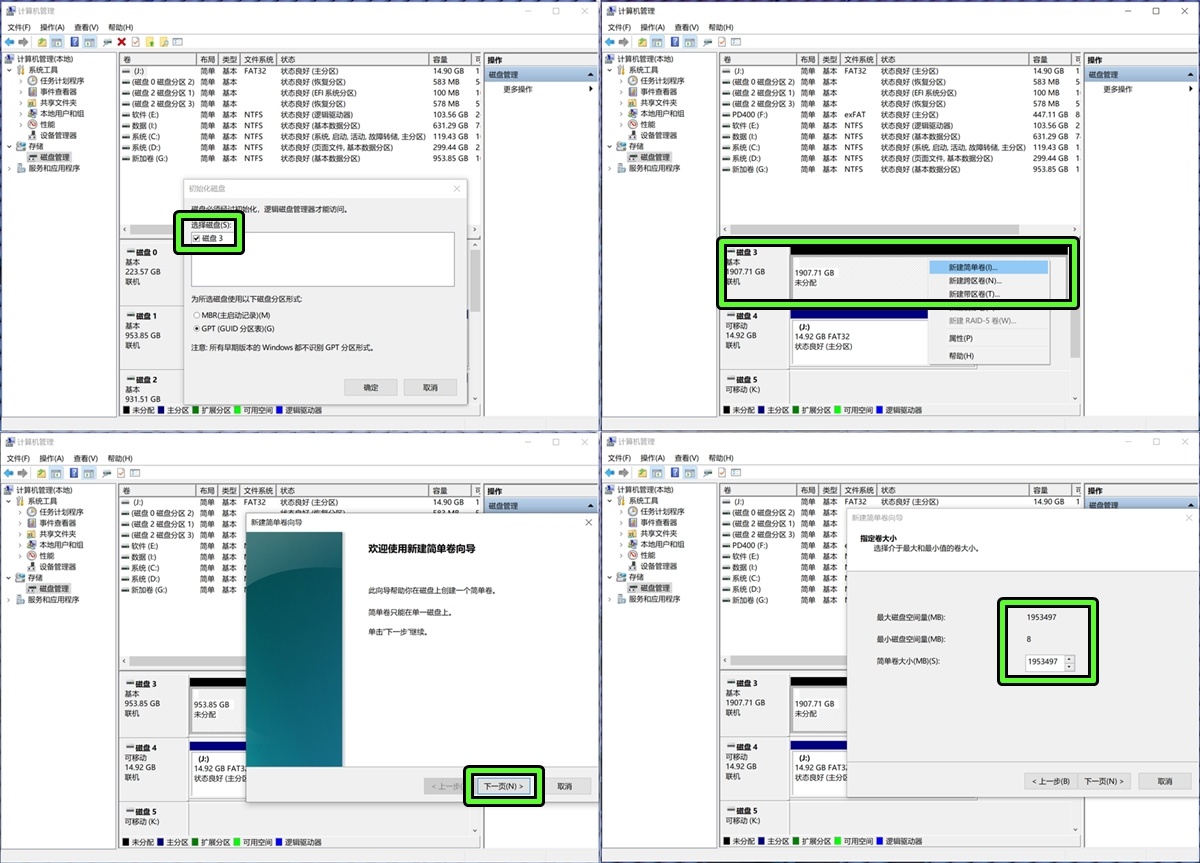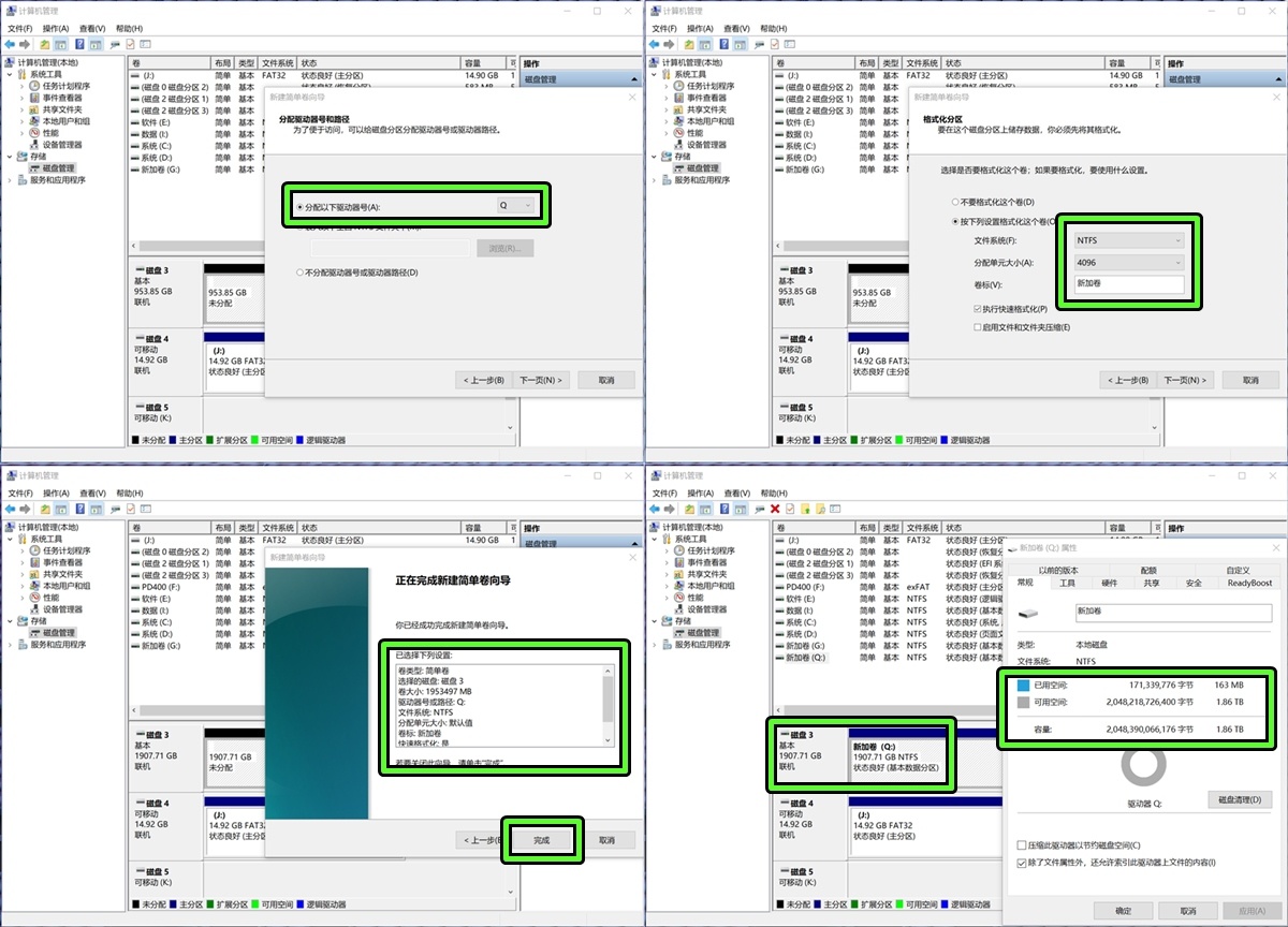 八、磁盘3正确显示“新加卷Q“,W10系统下容量显示为1.86T,便可正常使用。