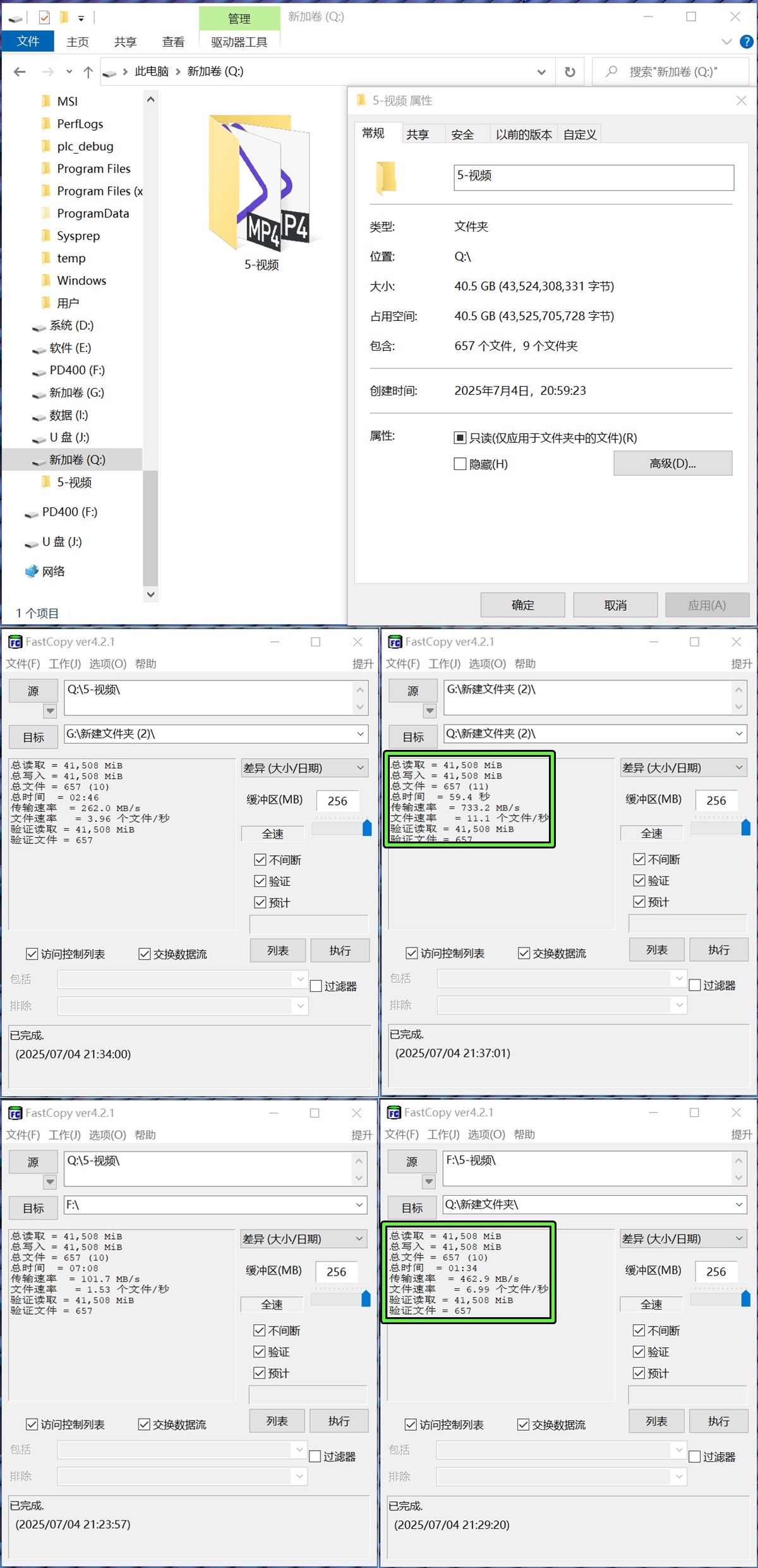 模拟日常传输文件进行FastCopy测试,文件大小40.5G多为短视频及一些资料,下面开始对拷测试,差异硬盘模式进行。