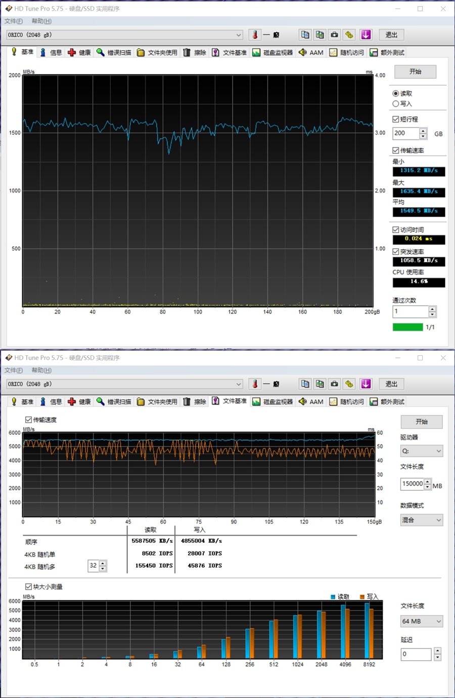 基准测试,200G文件持续负载读写,最小速度1315+ MB/s,最大速度1635+ MB/s,平均速度1549+ MB/s,突发速度1058+ MB/s。