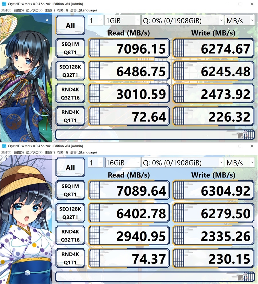 1GB,读取速度7096+ MB/s ,写入速度6274+ MB/s。