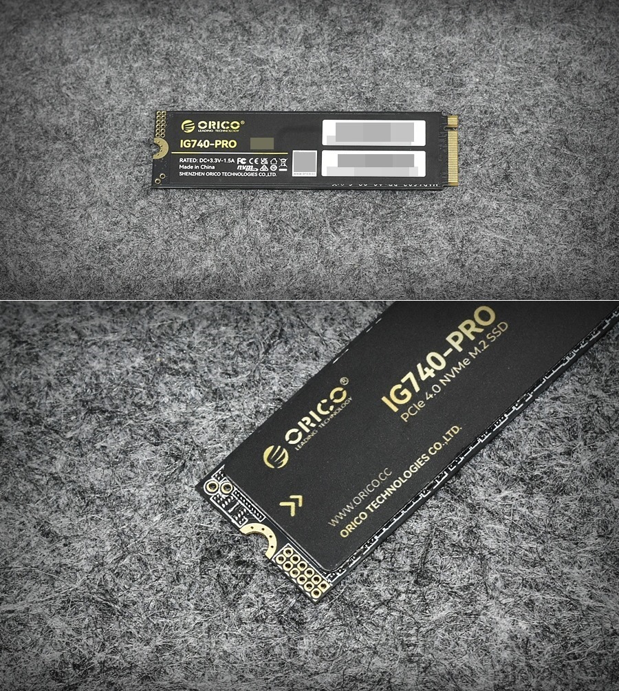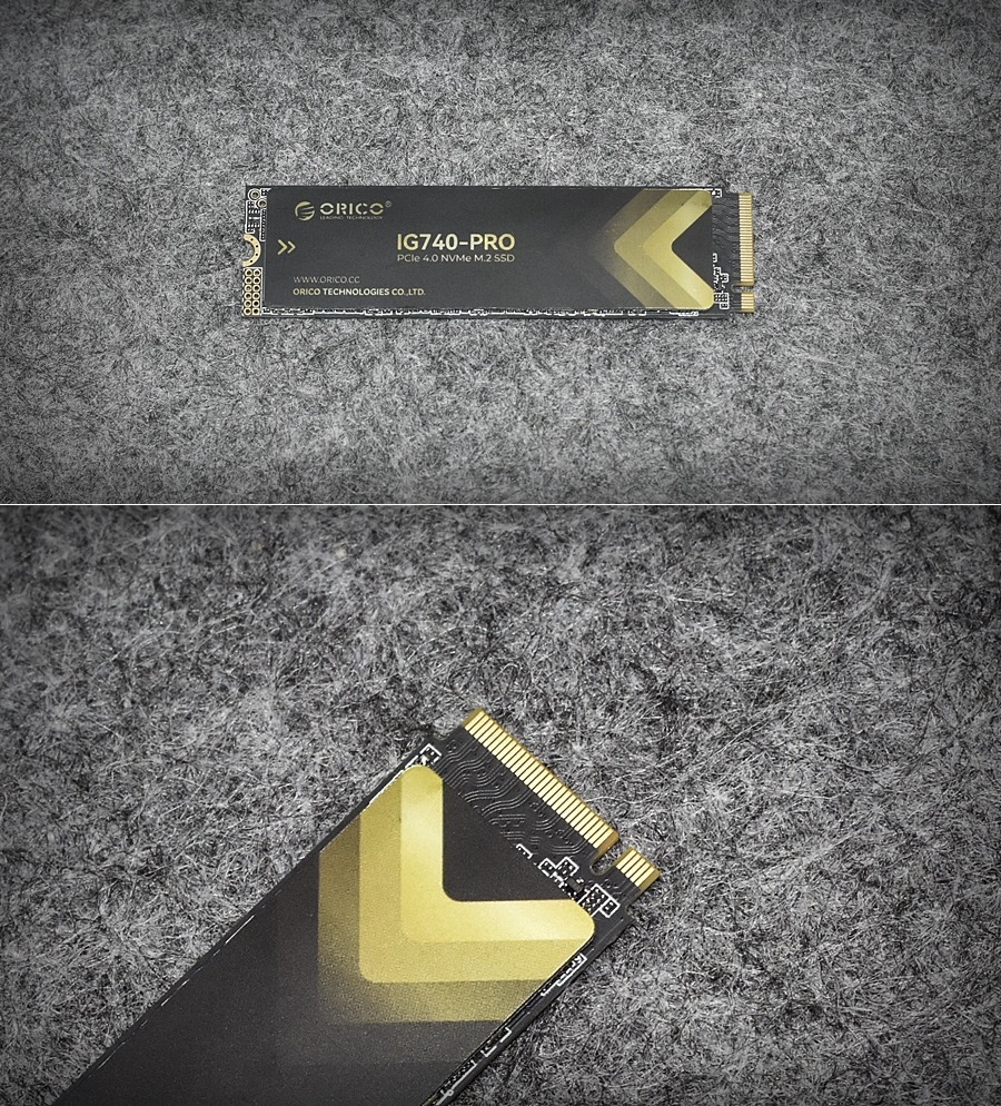 奥睿科IG740固态硬盘为标准的2280尺寸。正面黑色贴纸经过精心设计,采用金色箭头渐变,营造出速度感。中间级左侧印刷有产品型号IG740-PRO、ORICO LOGO标识、网址等内容。