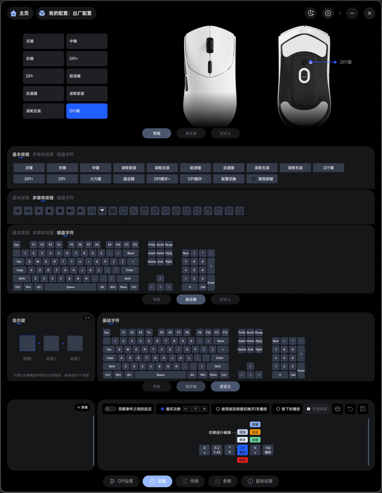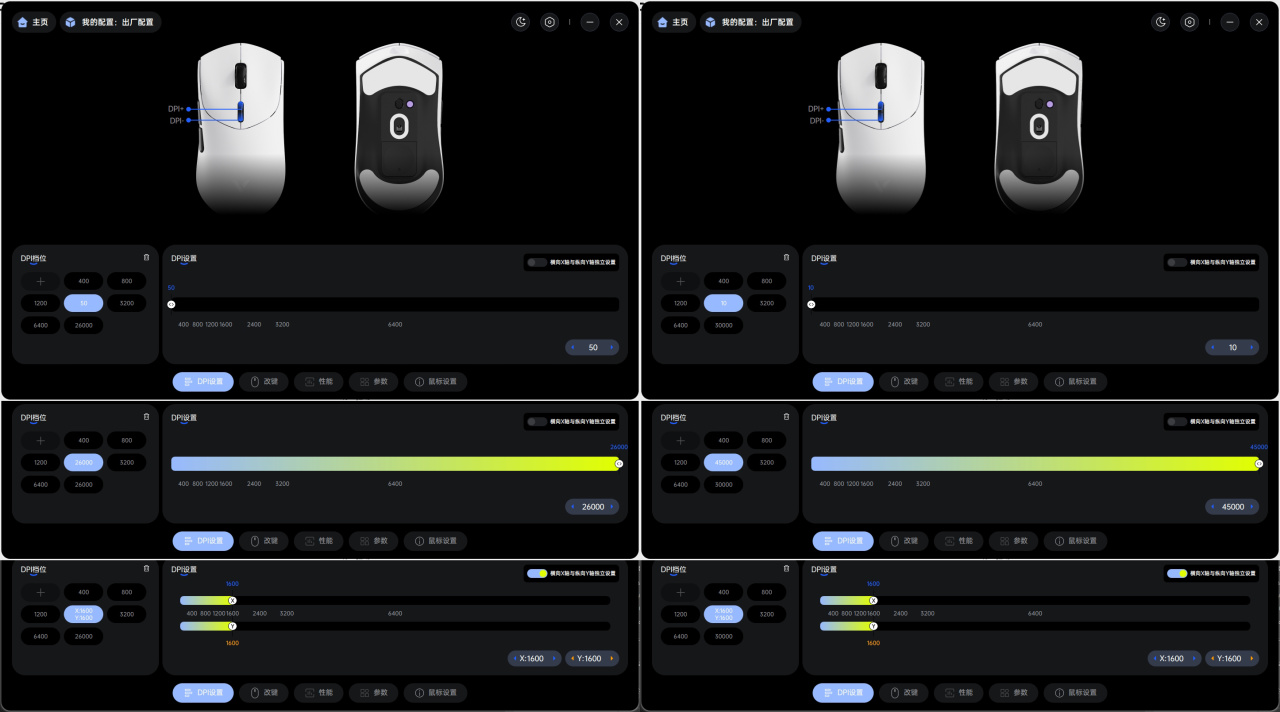 ▼驅動裏的功能我就簡單講解一下吧。首先是DPI設置,DPI調節滑條上有7檔預設數值,點擊對應的數值就可以一鍵設置爲該參數,很方便,雖然兩款可調節的DPI範圍不同,VT7爲50-26000,MAX版爲10-45000,但是它們都能以最低10爲單位調節,更容易調出適合自己的DPI,這款VT7系列也支持開啓獨立的X/Y軸DPI數值,對於設置裏沒有單獨垂直靈敏度調節的FPS遊戲來說,這個功能那是相當有幫助