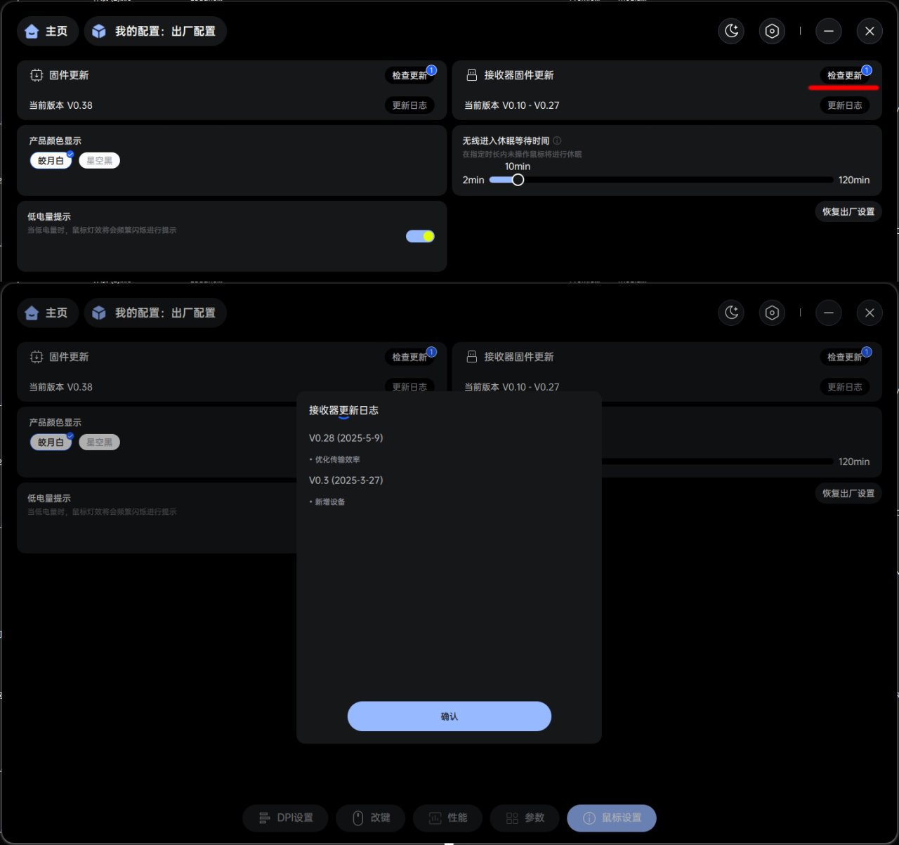 ▼鼠標圖案右上角可以進行固件更新,建議剛到手第一件事先把固件升級到最新版本,以體驗到最新的功能,接收器不連接鼠標,單獨插電腦上也可以進行升級