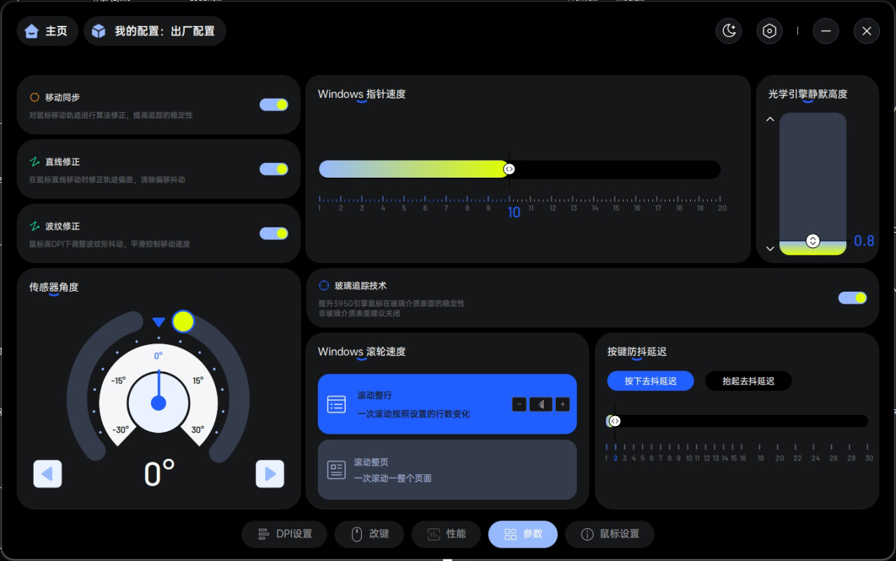 ▼參數設置裏面前三項如果全關掉,光標的移動和軌跡會完全按照你實際的鼠標移動軌跡去執行,而這些功能開啓後,驅動會通過算法對你實際的鼠標移動軌跡進行優化修正,可能會產生一點點忽略不計的延遲,但是光標的軌跡或移動速度會更加平滑,不容易受手抖影響,大家根據自己的需求開啓與否;玻璃追蹤技術開啓後,在玻璃介質也能像在鼠標墊上一樣去操作鼠標了,不過手感可能會削弱一些