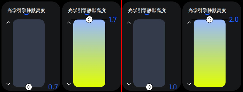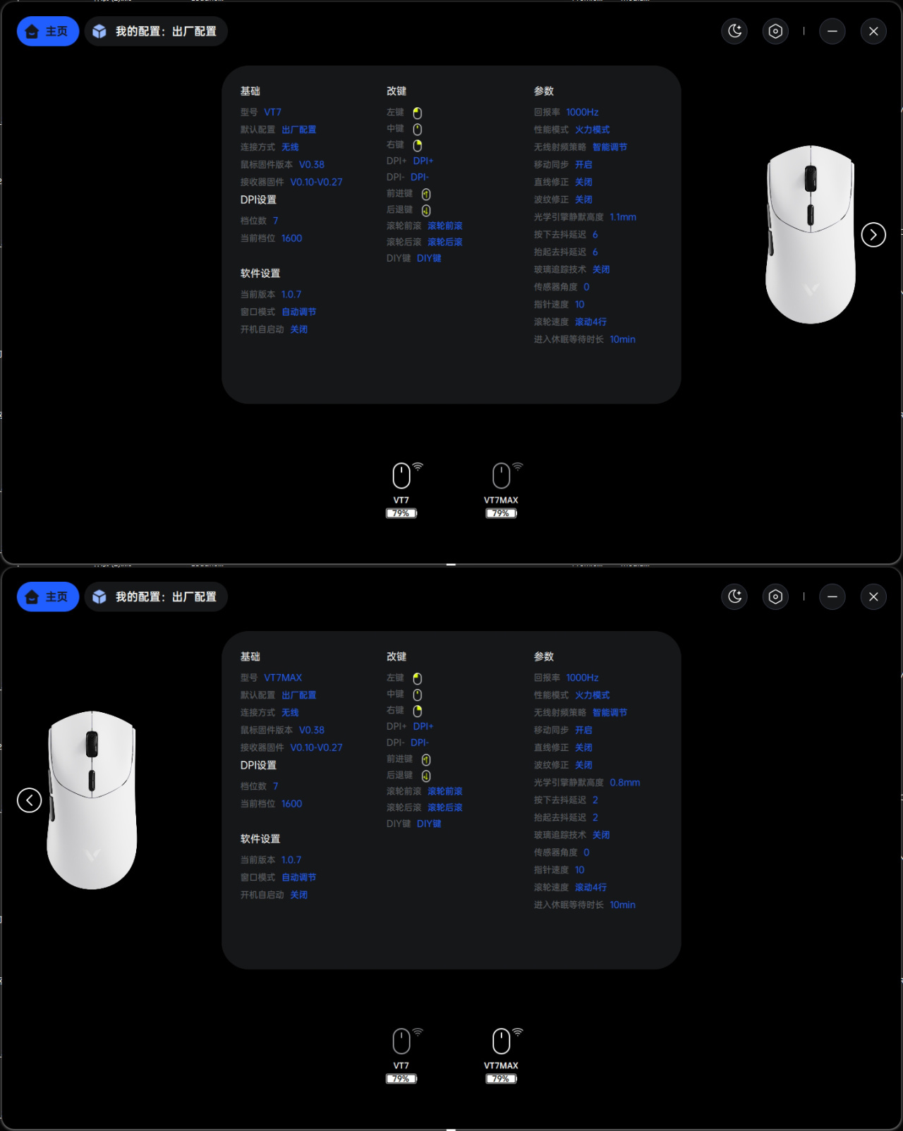 ▼光學引擎靜默高度就是鼠標抬離平面後還能響應的高度,兩款鼠標可調節的範圍是不同的,VT7爲0.7-1.7,MAX版爲1.0-2.0,不過都是11檔高度可調,比較適合手臂流玩家去自定義,一般玩家建議默認即可