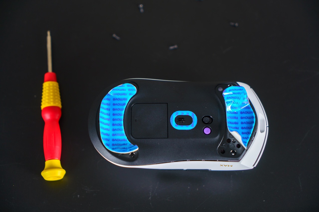 ▼用VT7 MAX拆解演示,撕開腳墊,擰下上兩顆下三顆螺絲,用指甲在上下蓋縫隙處劃一圈比往外撬,然後往後推就可以拆開了,比較輕鬆