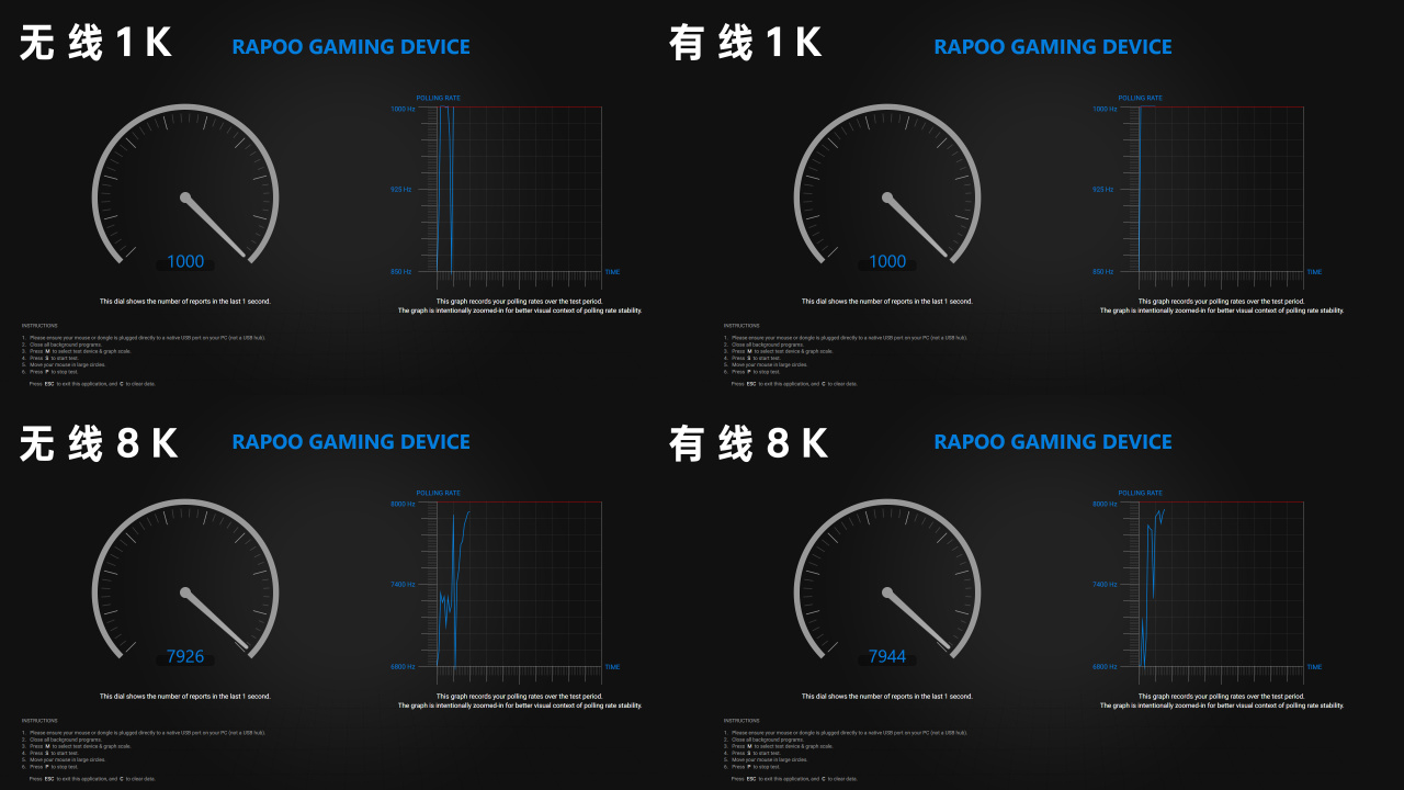 ▼回報率也就是鼠標輪詢率,參數開的越高,鼠標響應速度會越快,延遲會越低,鼠標移動會更加精準及時,不過功耗也會增加;做爲雙高速鼠標,實測無線有線的8K回報率都跑滿了(會受電腦配置和顯示器刷新率影響)