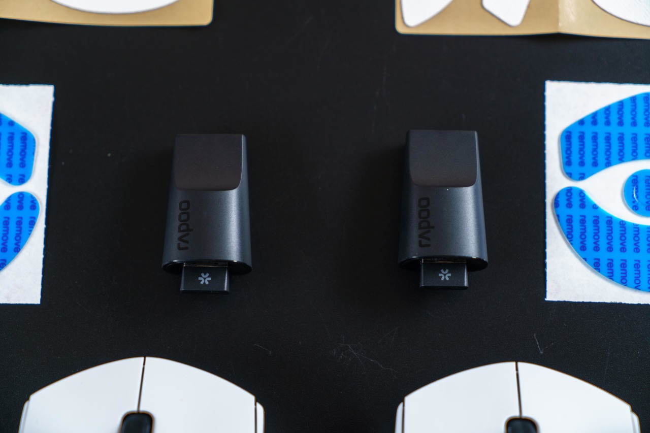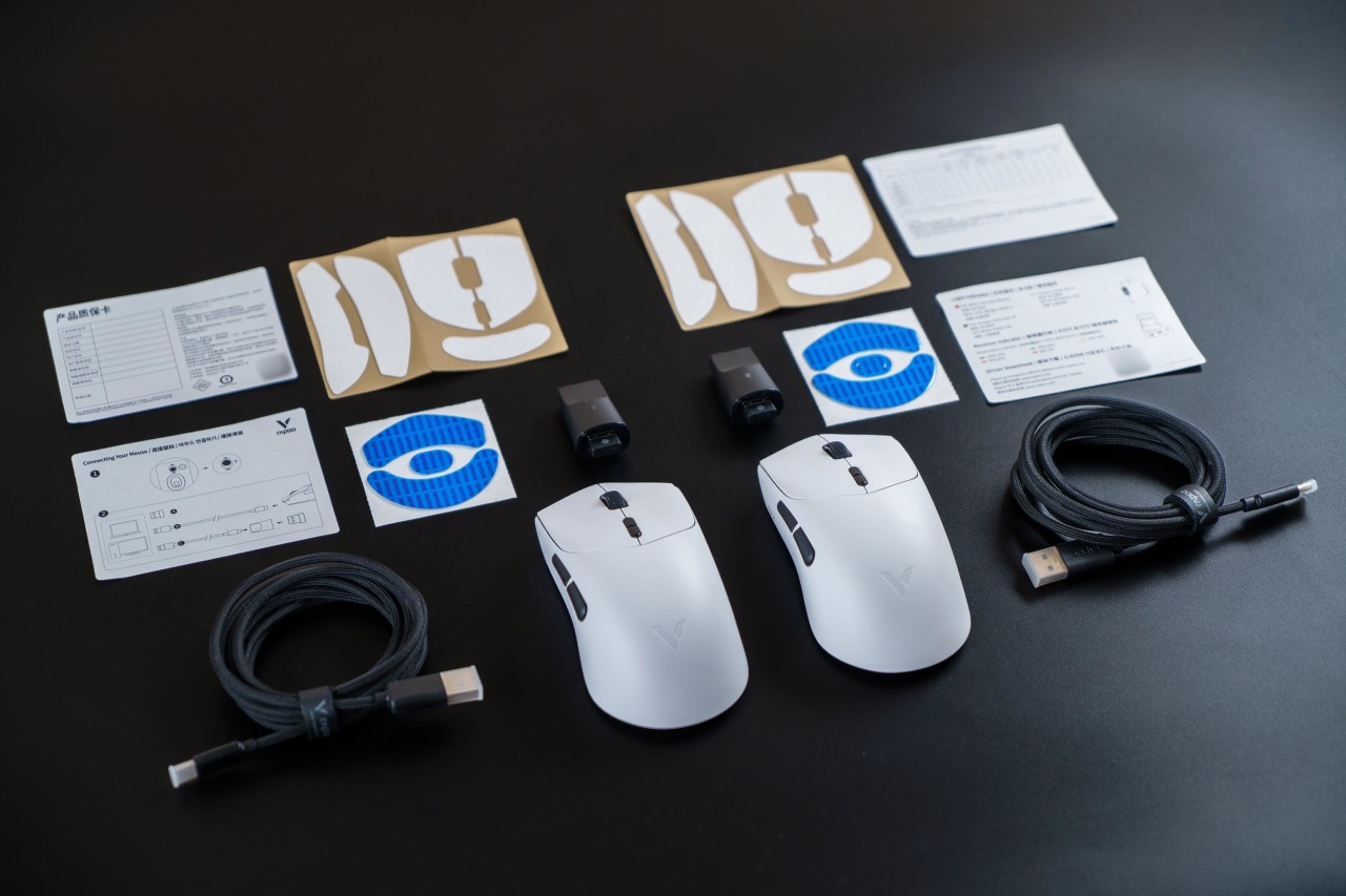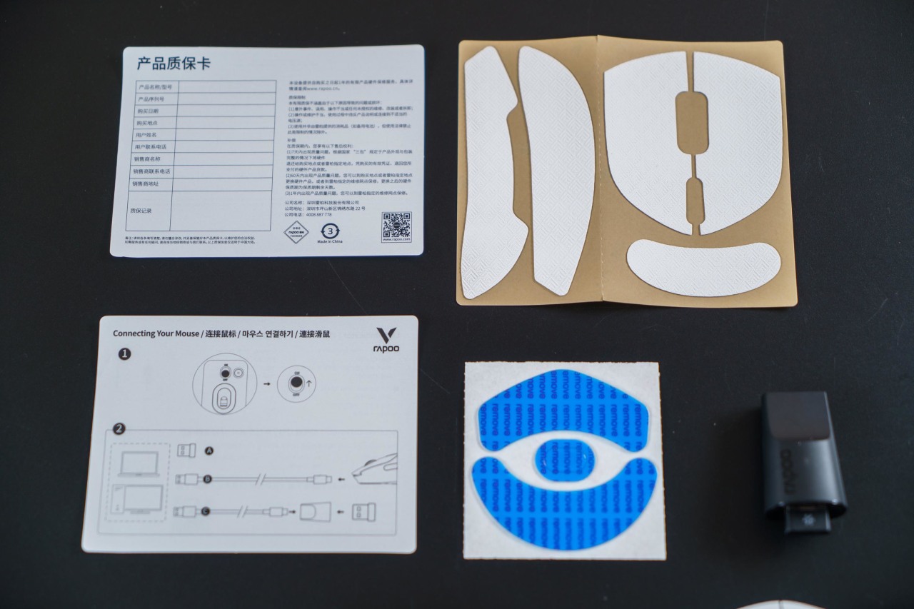 ▼取出所有東西,除了鼠標本體之外,兩款都有一本使用說明書、、一張保修卡、一張防滑貼、一張備用"冰感"PTFE特氟龍電競大腳墊、一根8K帶屏蔽和鍍金接口的高速編織線、一個重新設計過造型的USB轉換器