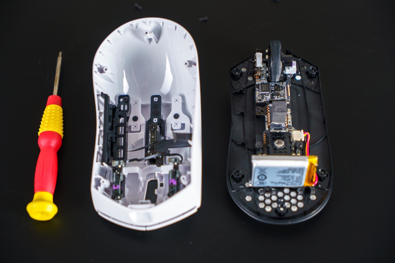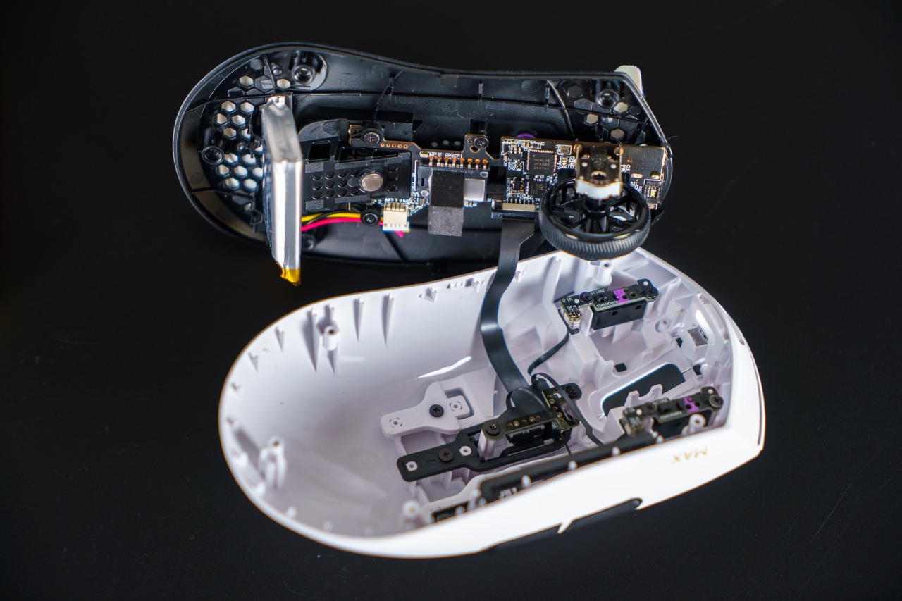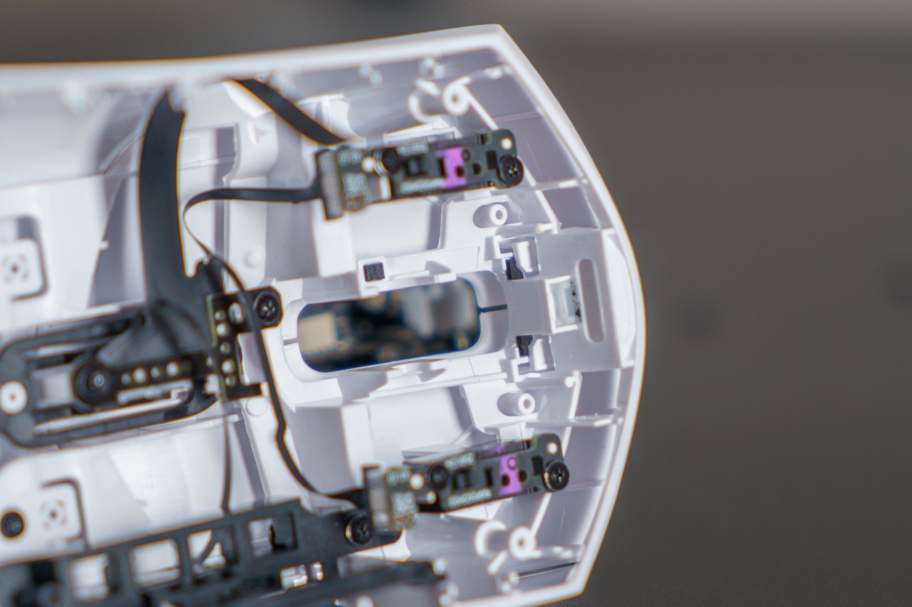 ▼左右鍵依舊是採用了分離式微動PCB,兩個按鍵都能夠獨立進行手感上的調整,預壓扭簧的設計一定程度上能夠延長使用壽命,也能提高一些抗摔能力;VT7使用1億次壽命的歐姆龍微動,VT7 MAX 使用的是1.2億次壽命的雷柏瑞訊定製特調光微動,媲美燈廠和堅如磐石家的高端鼠標配置