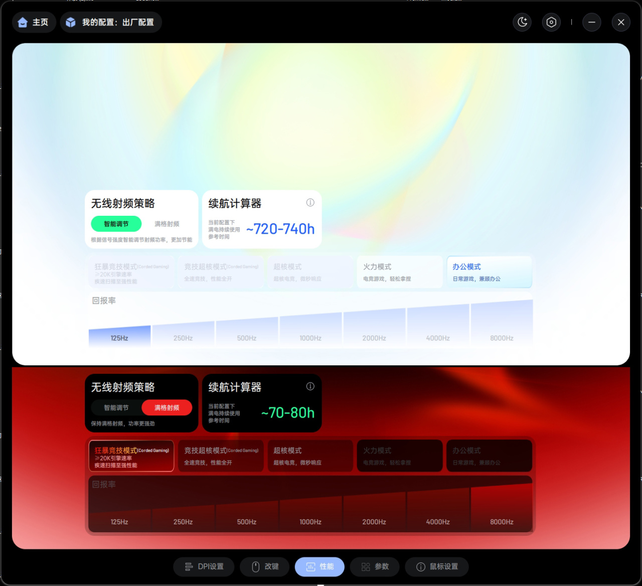 ▼性能頁面裏的模式切換功能是這次VT二代重大升級點之一,增加了無線射頻相關的設置,可根據信號強度自動調節射頻功率以延長續航時間或開啓信號滿功率運行;MAX版更是能開啓狂暴競技模式,光學引擎和無線射頻模塊直接榨乾性能,火力全開,管它什麼費不費電,猛就對了,幹就完了!哪怕把鼠標性能相關的設置全拉滿,滿電狀態的VT7 MAX也能連續工作70~80小時,一天算用它個8小時,可以做到8-10天一充,太強了,如果以最低性能狀態使用,一天24小時不間斷使用大約可以一個月一充,一天用8小時更是能約三個月一充,無敵了好吧!請把雷柏YYDS打在公屏上!!!!據瞭解,雷柏是目前唯一一家同時具備最高性能固件和自適應調節功耗的廠家,更是能夠通過設置配置文件,把對應模式捆綁在指定的應用程序上,根據啓動不同的應用程序,自動切換對應的模式,無敵無敵!真的無敵!這個功能簡直遙遙領先
