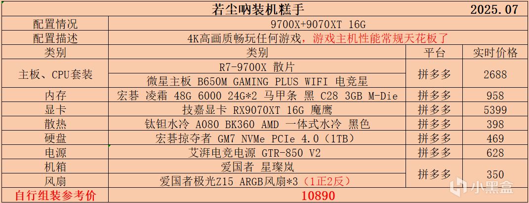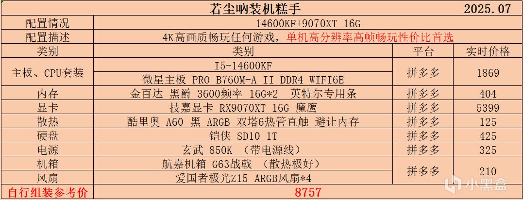 八、8000-9000預算,這個預算選擇空間比較小,基本是上一個預算的補充,但勉強可以搭配9070XT,可以4K暢玩所有遊戲了,正常購買大概需要九千出頭: