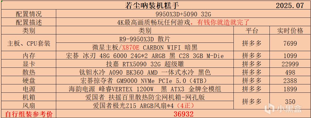 最後,就是給預算非常充足的富哥寫高預算搭配,本次就不推薦5090D了,所有最頂級搭配全部使用滿血5090: