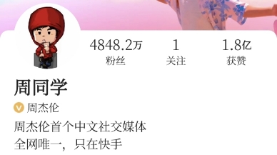 2020年6月1日,周杰伦正式入驻快手,开通了其首个中文社交媒体账号“周同学”,并获得官方认证。该账号个性签名为“周杰伦首个中文社交媒体账号,全网唯一,只在快手”。快手端曾在粉丝数突破1,000万时举办魔术直播,吸引数百万观众围观,互动量一度高达亿级。