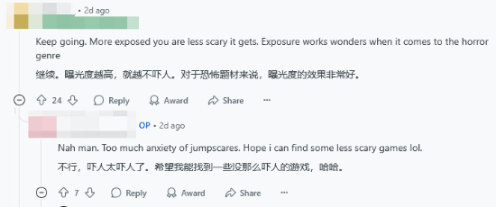 有玩家鼓励表示:只要坚持下去就好了,多和恐怖元素接触接触就“脱敏”了。帖主没过多久就回复表示:“不行,jumpscare实在是太吓人了。”