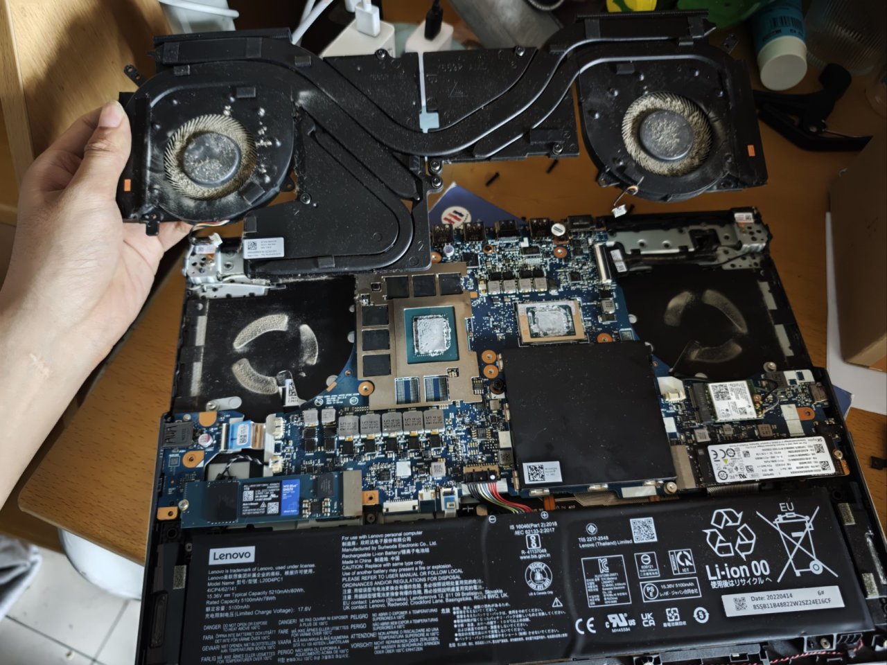 把散热板拆下来,就可以更换/加装固态硬盘或者升级内存了,我们再把风扇的螺丝和排线取下,就可以拆下散热模组,精细的可以用电子仪器清洗液,粗糙的直接拿去水洗(真的可以洗但前提是要完全干燥)