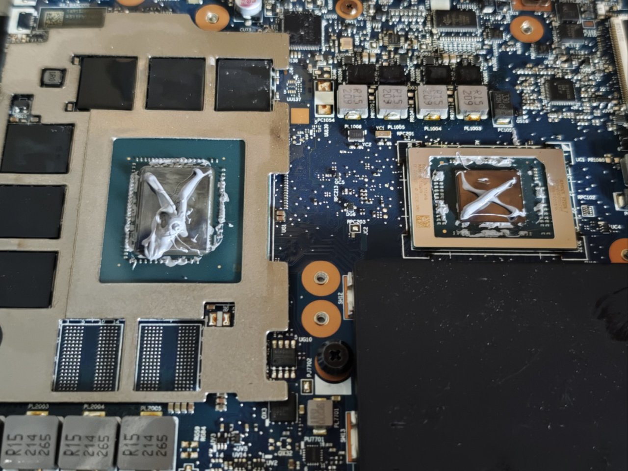 拆下散热模组我们就能看到大名鼎鼎的CPU和GPU,处理器跟显卡,整个电脑最贵的核心脑子(可以看出给我装电脑的师傅硅脂涂挺多)
