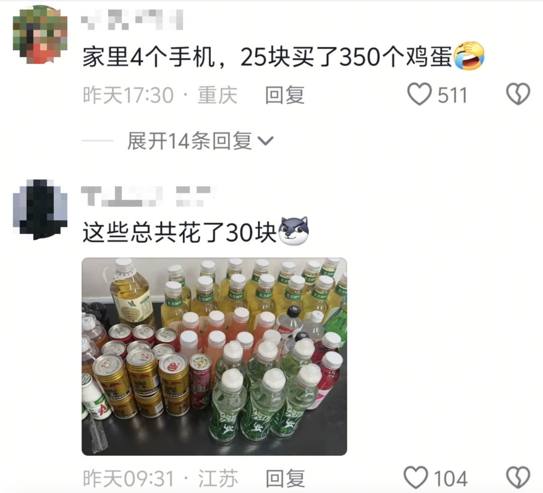 有一家子 4 個賬號,花了 25 塊錢買了 350 個雞蛋的,也有 30 塊錢愣是把自家整成了小賣部的。。。
