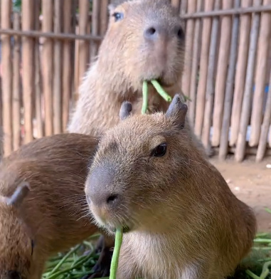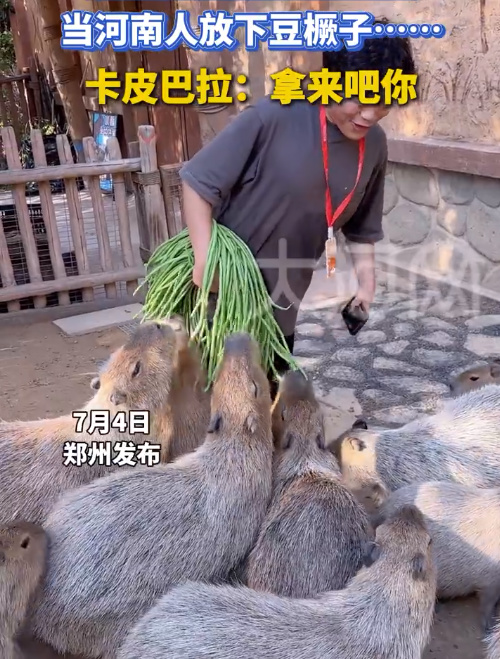 7月4日,河南郑州,一动物园水豚狂炫豆角引来众多网友围观,饲养员表示:这群卡皮巴拉特别爱吃豆角,一天会给它们喂30多斤,大概有800多根。