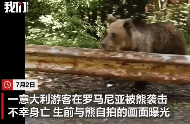 7月2日,一意大利游客在罗马尼亚被熊袭击不幸身亡,生前与熊自拍的画面曝光。事发时该男子与一群摩托车手同行,停下来靠近一头熊自拍,随后那头熊扑向男子将他咬伤,然后将其遗体拖入约60米深的山沟。报道称,男子最后拍摄的其中一段画面显示他似乎试图伸手喂熊。据当地媒体报道,这头熊已被击毙,警方正对此事进行调查。