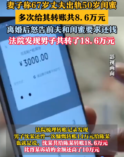 离婚后,胥某将67岁前夫沈某与50岁的闺蜜陈某告上法庭。胥某查到,2023年到2024年,前夫多次给闺蜜陈某转账总计8.6万元,要求陈某返还其中的一半共计4.3万元。