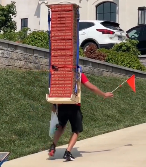 近日,外国一名外卖小哥使用滑轮平衡车配送披萨,一次性运送的披萨堆叠高度超过其身高。收餐的女性客户对创意配送方式感到惊喜,主动与小哥合影后支付了100美元小费。