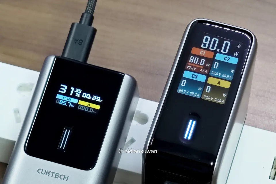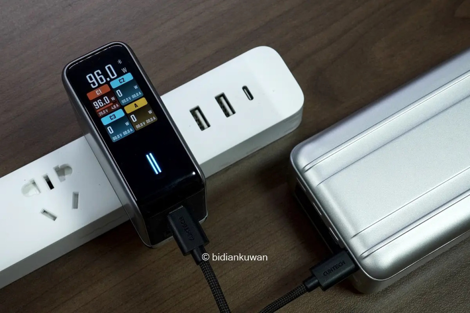 C1、C2单C口多协议120W输出支持,支持双口盲插,可以给手机、笔记本快速回血,下图是单C1口给我的酷态科10号充电宝充电,充电宝当前电量31%,充电功率稳定在90W。给vivo X100sPro和iQOO13单C口可达到80W快充,给MBP16和联想YOGA Pro14s可以达到100W快充。