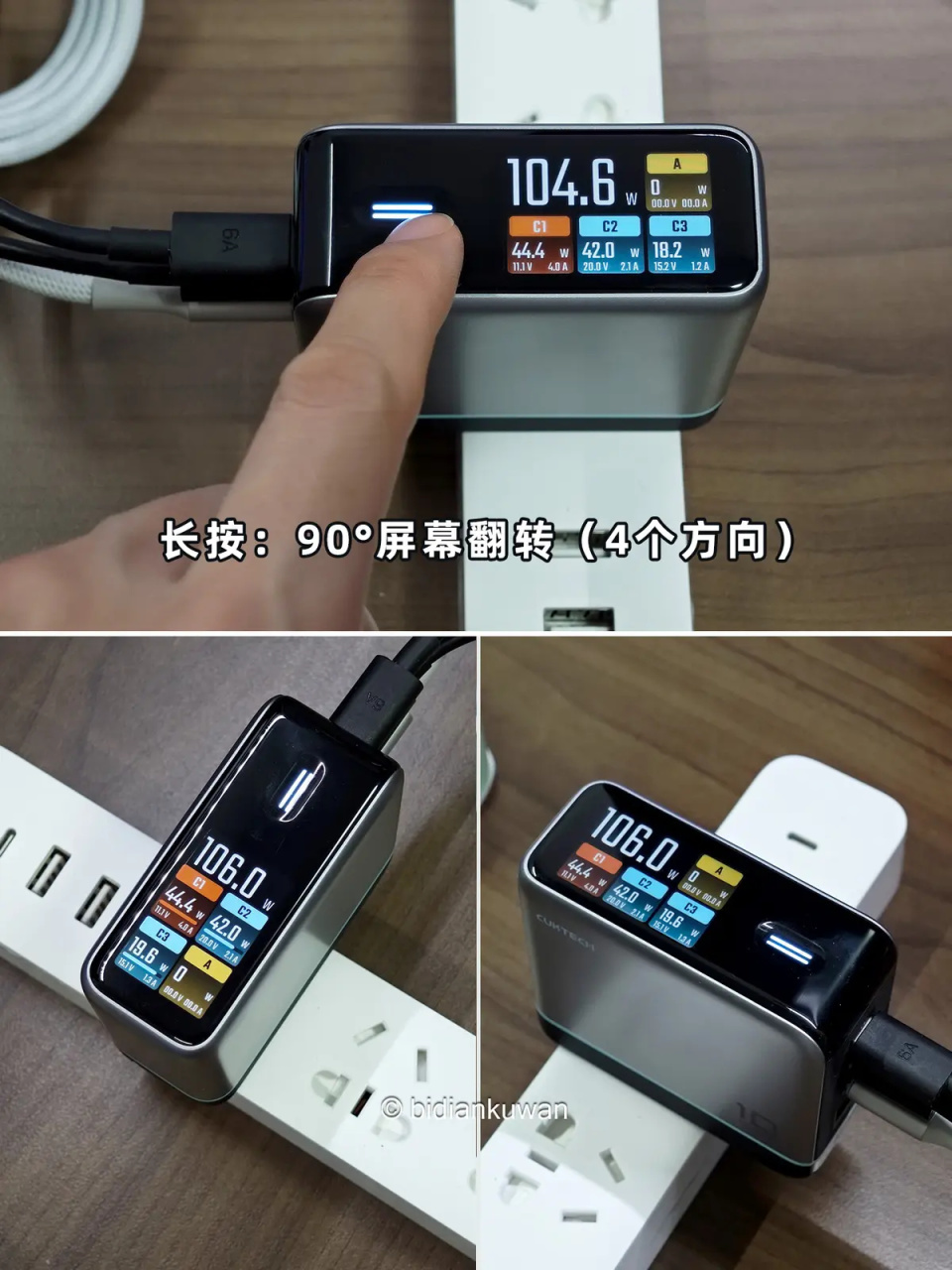 ▶酷态科10号Ultra氮化镓充电器(120W超级电能充,3C+1A四口带TFT智能彩屏快充头),三围76 x 67 x 33mm。