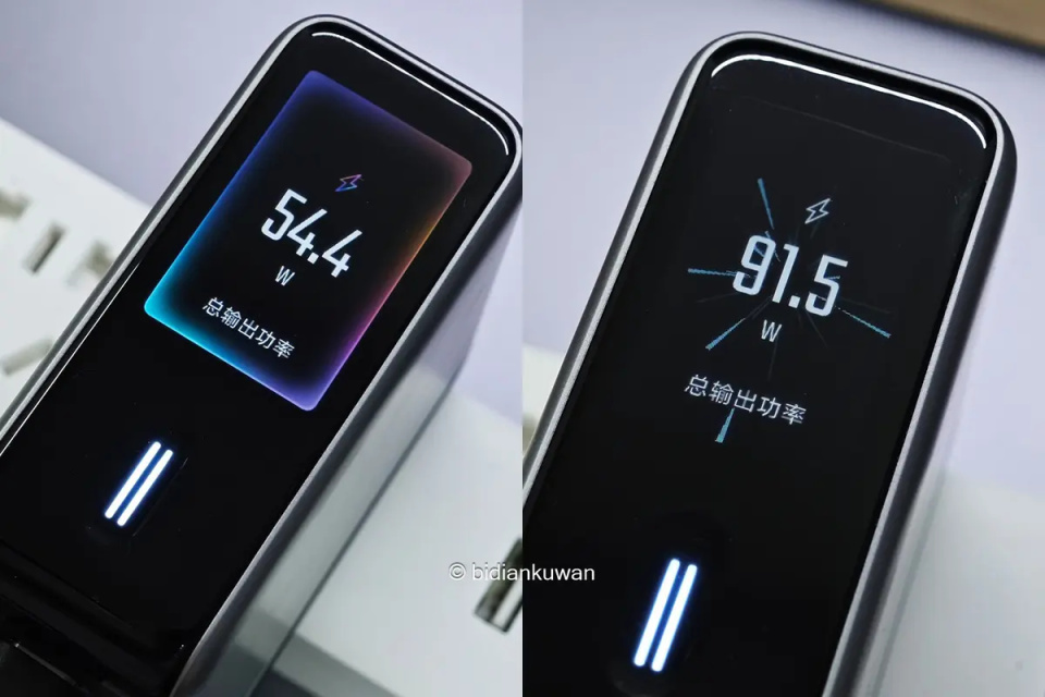 单击主键可以翻页显示,比如下图这个界面,是只显示总输出功率。我发现目前共有2种特效,左图是功率略低时,右边是高速输出,但我觉得左边的UI更好看,建议设计师给极速充换个更炫的特效。