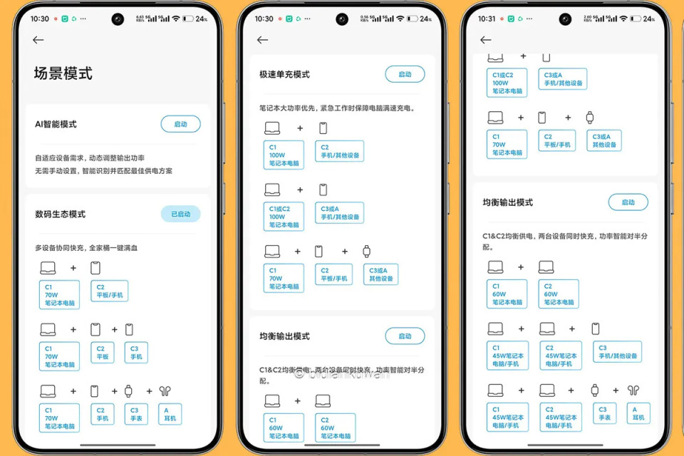 C1+C2双口同时输出会(依据设定的4种模式之一)自动分配为最佳状态。如下图为米家APP中设定10号Ultra开启“极速单充模式”,***配功率更快,实测C1输出78.4W,C2输出16W,总输出84.4W。