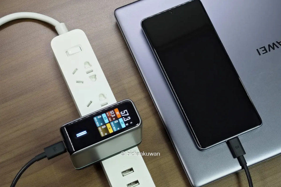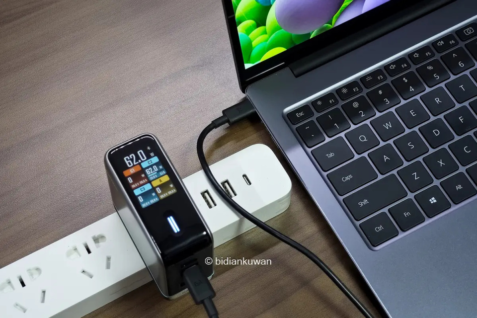 其他品牌设备兼容激活PD、QC、PPS、UFCS融合快充、华为SCP/FCP等,ADC2.0自适应。如下图给华为MateBook 14(最高支持C口65W)充电,当前笔记本电量62%,充电功率稳定在62W左右。