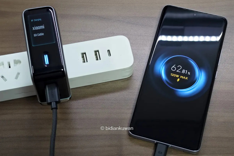 小米全系澎湃快充支持,下图是单C2口给给我的小米12Pro充电,激活120W MAX标志,同时还可以看到10号Ultra屏显检测到品牌线缆规格(小米6A线)。