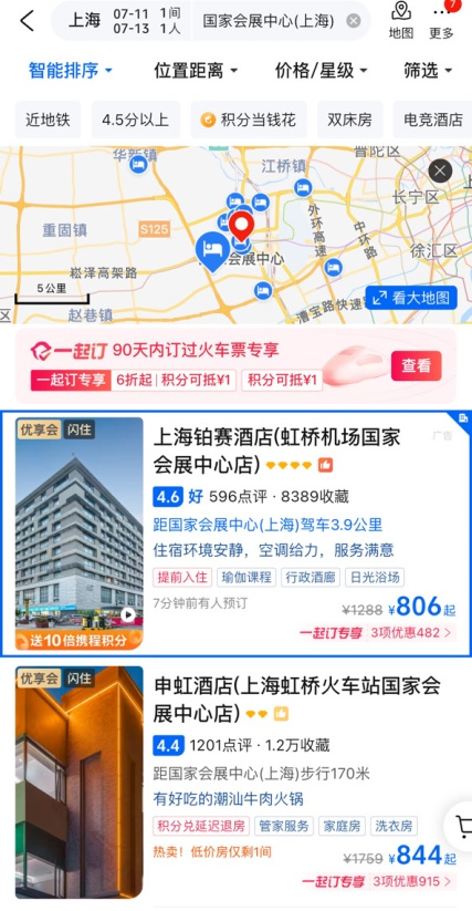 看完天气,再和大家说说住宿问题,不少朋友都考虑过在BW会场国家会展中心附近入住。但这其实是一个误区,住得近不等于更方便。国家会展中心周边有各种立交桥和环道,地图上看着近实际上去检票口大概率要东绕西绕。加上国家会展中心在上海偏西,距离其他游玩景点普遍较远,综合考虑下来并不方便。重要的是,目前国家会展中心附近的酒店已经涨价到800多一晚了!