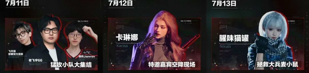 最后再来看看射击游戏品类。相比女性向和二游,腾讯《三角洲行动》的展台活动颇为硬核,官方设置了游戏内任务,玩家加入对局与特邀嘉宾进行对战,嘉宾包括老飞宇、甜药、飞天狙、卡琳娜、腥味猫罐等。是的没看错,玩家可能需要同时面对地图理解拉满的全装老飞宇、飞龙在天的惩罚者甜药以及自动吸附全地图大红的飞天狙,硬核程度拉满了吧。