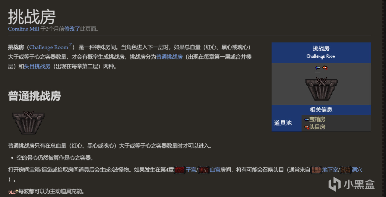 挑戰房有概率會生成在第一層後的每一層,生成的必要前置條件爲進入下層時角色的總血量大於等於心之容器(血上限)的數量。