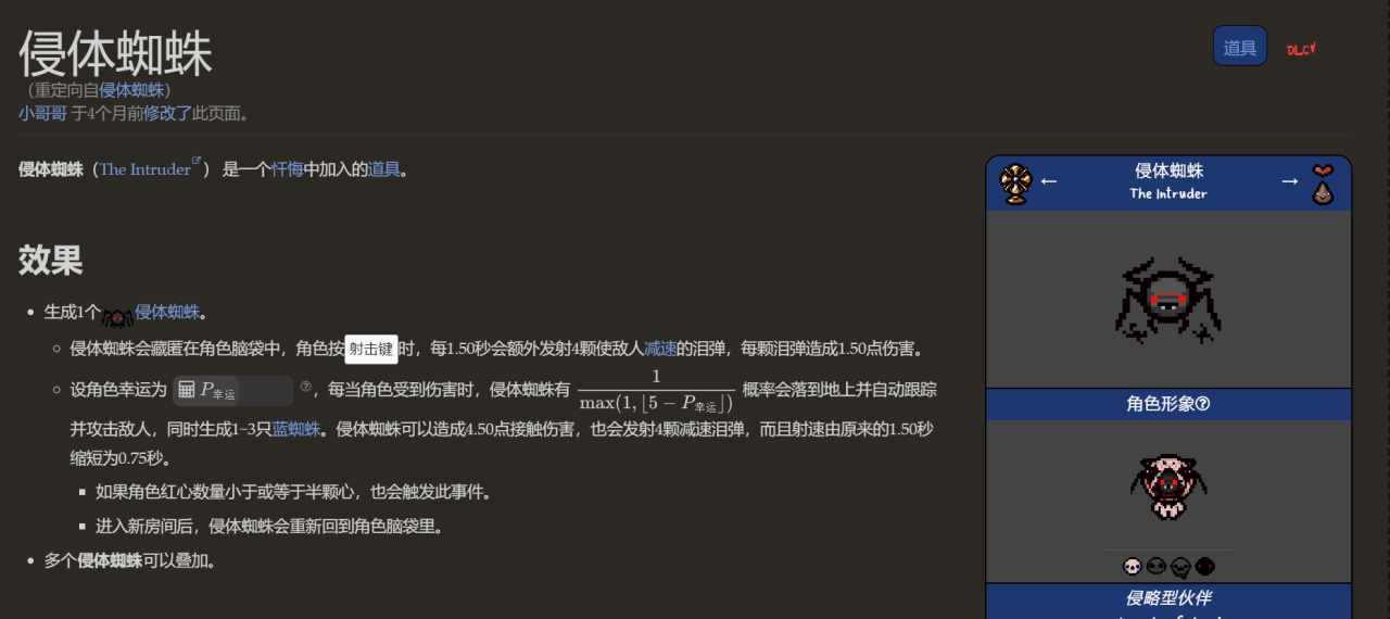 道具效果:每1.5秒發射固定傷害的四發子彈,有概率讓敵人減速,受傷後在本房間獲得暫時跟班