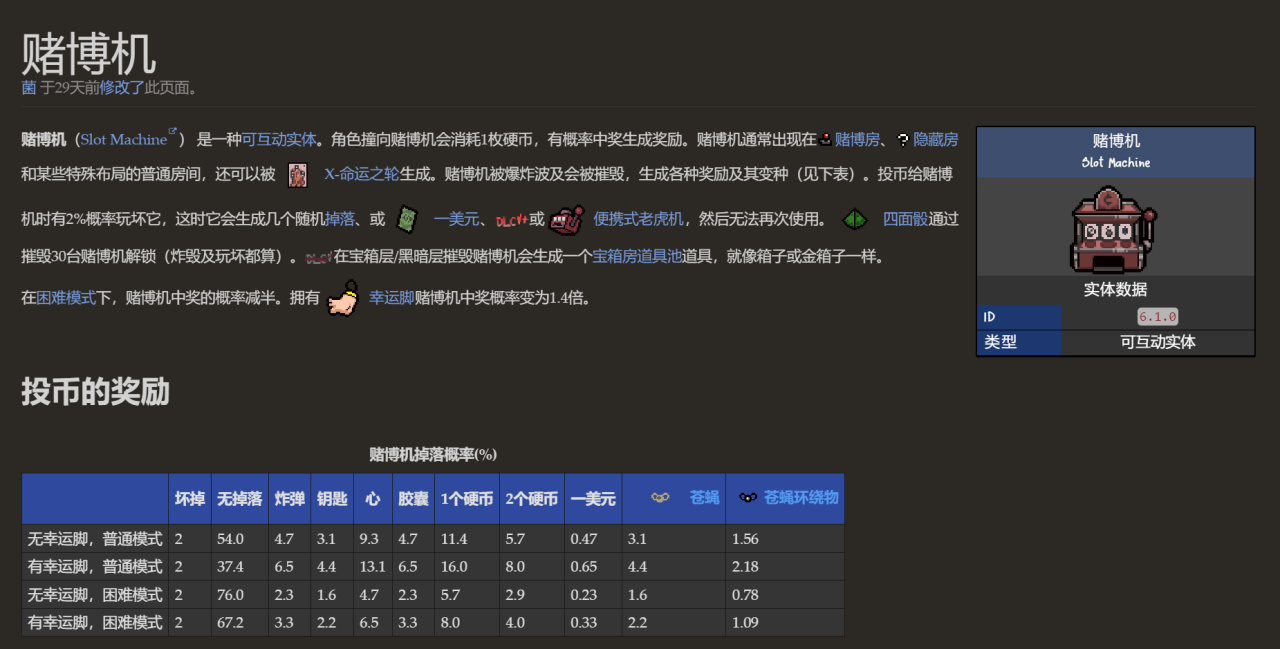 可以看出,就算在困難模式有幸運腳的情況下,賭博機生成獎勵的概率也不高,所以賭博機並不推薦投入硬幣(除非錢很多,炸彈鑰匙很少)