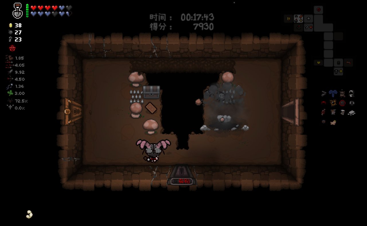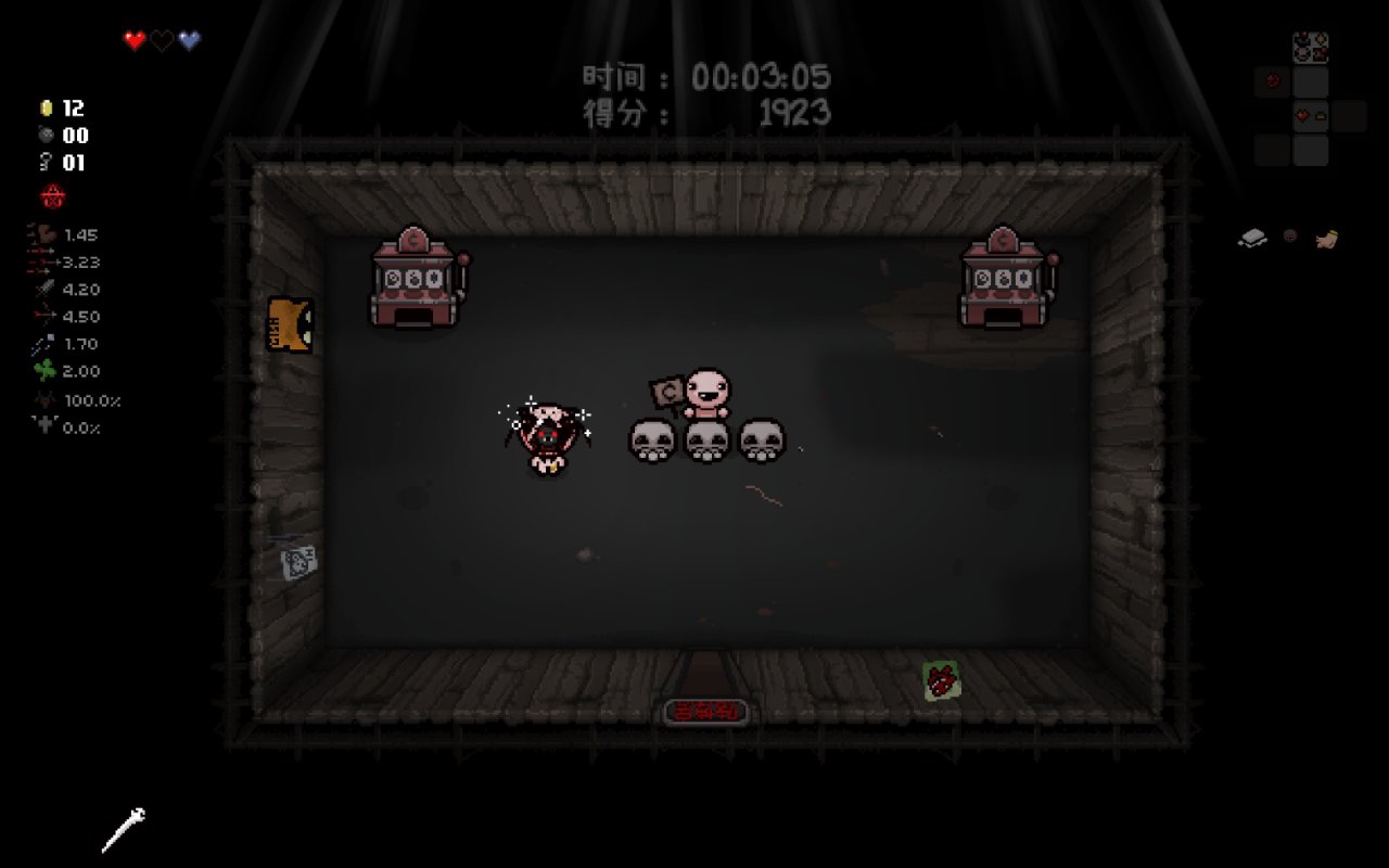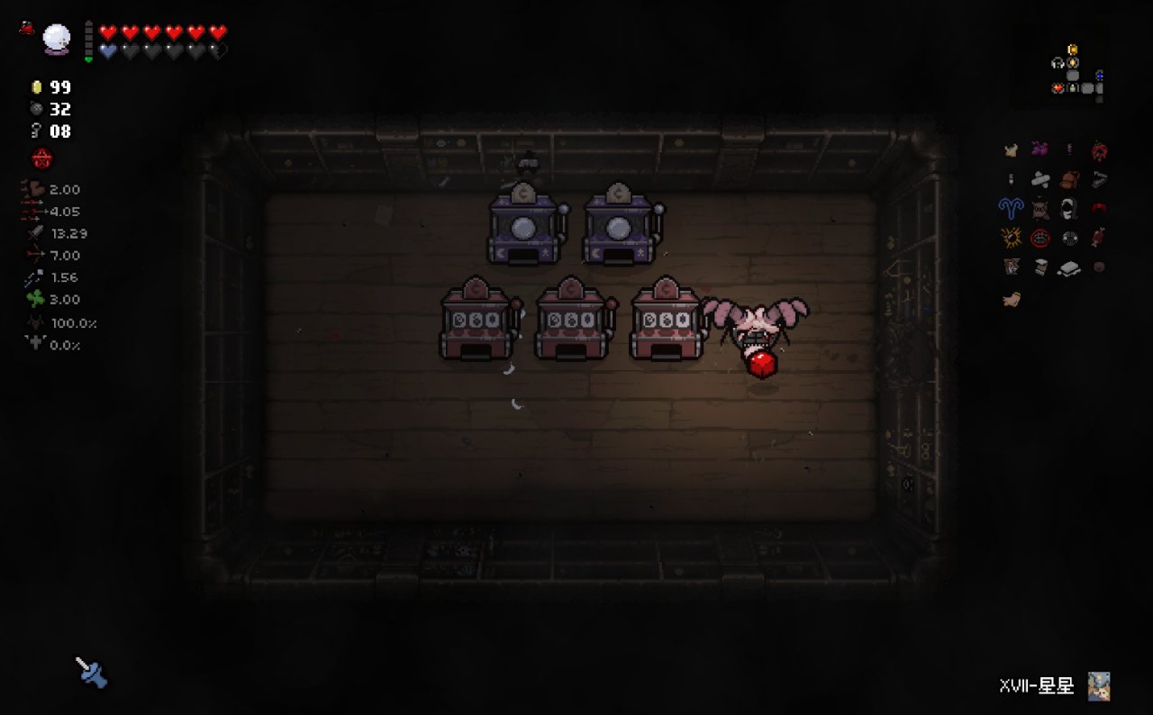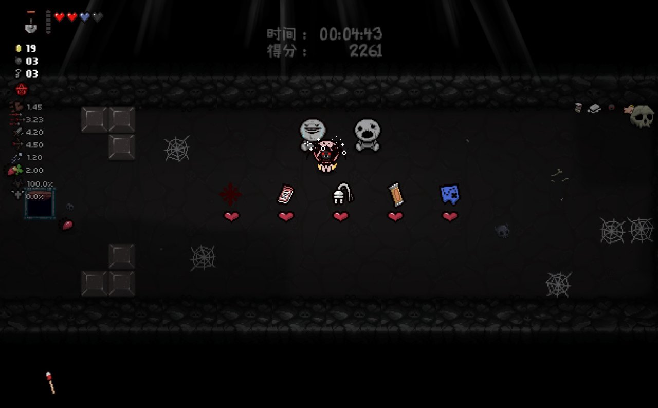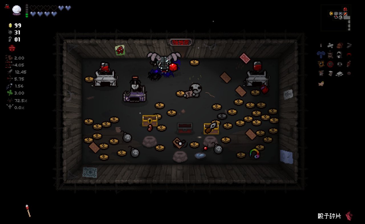 這兩個道具都十分符合該隱的成長需求,該隱不僅可以依靠自身能力獲得許多硬幣,同時自身自帶的1點幸運值和喫藥可能獲得的幸運值也可以大大提高獸性面具掉落魂心的概率,根據本期我給自己加的限制,我們本局只能換這兩個惡魔房道具了。