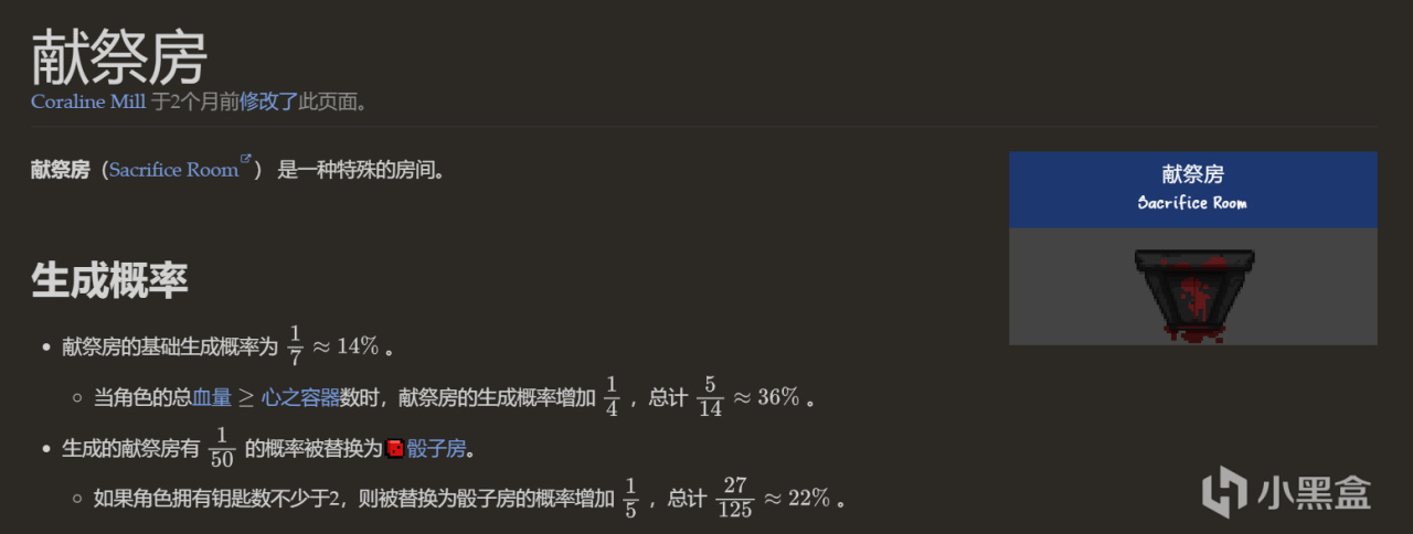 獻祭房每層有固定1/7(14%)生成概率,當角色的總血量≥心之容器時,生成概率將會提高至5/14(36%)