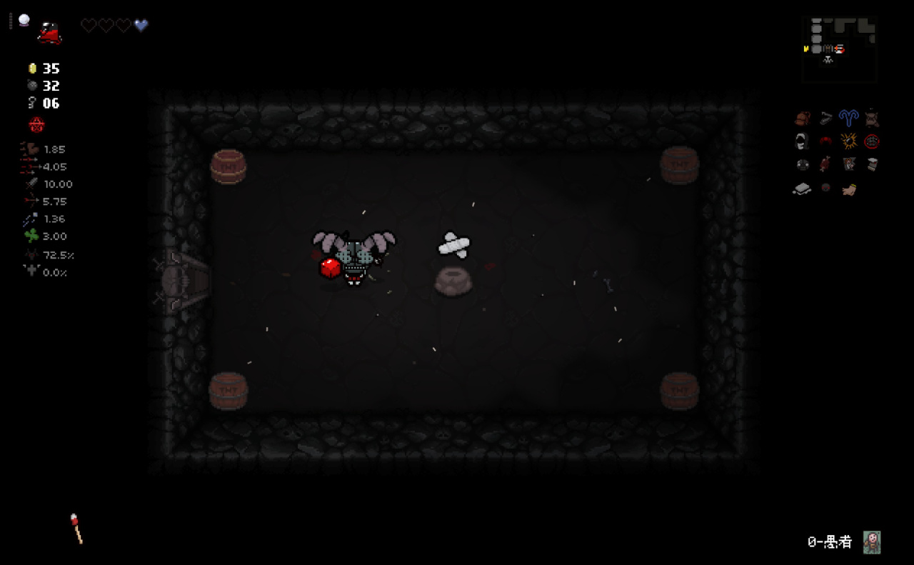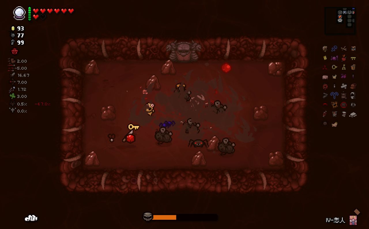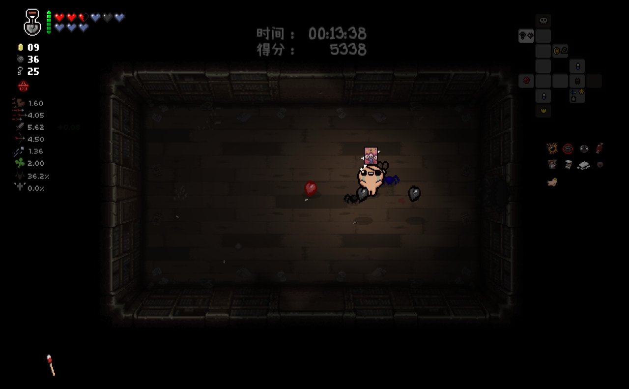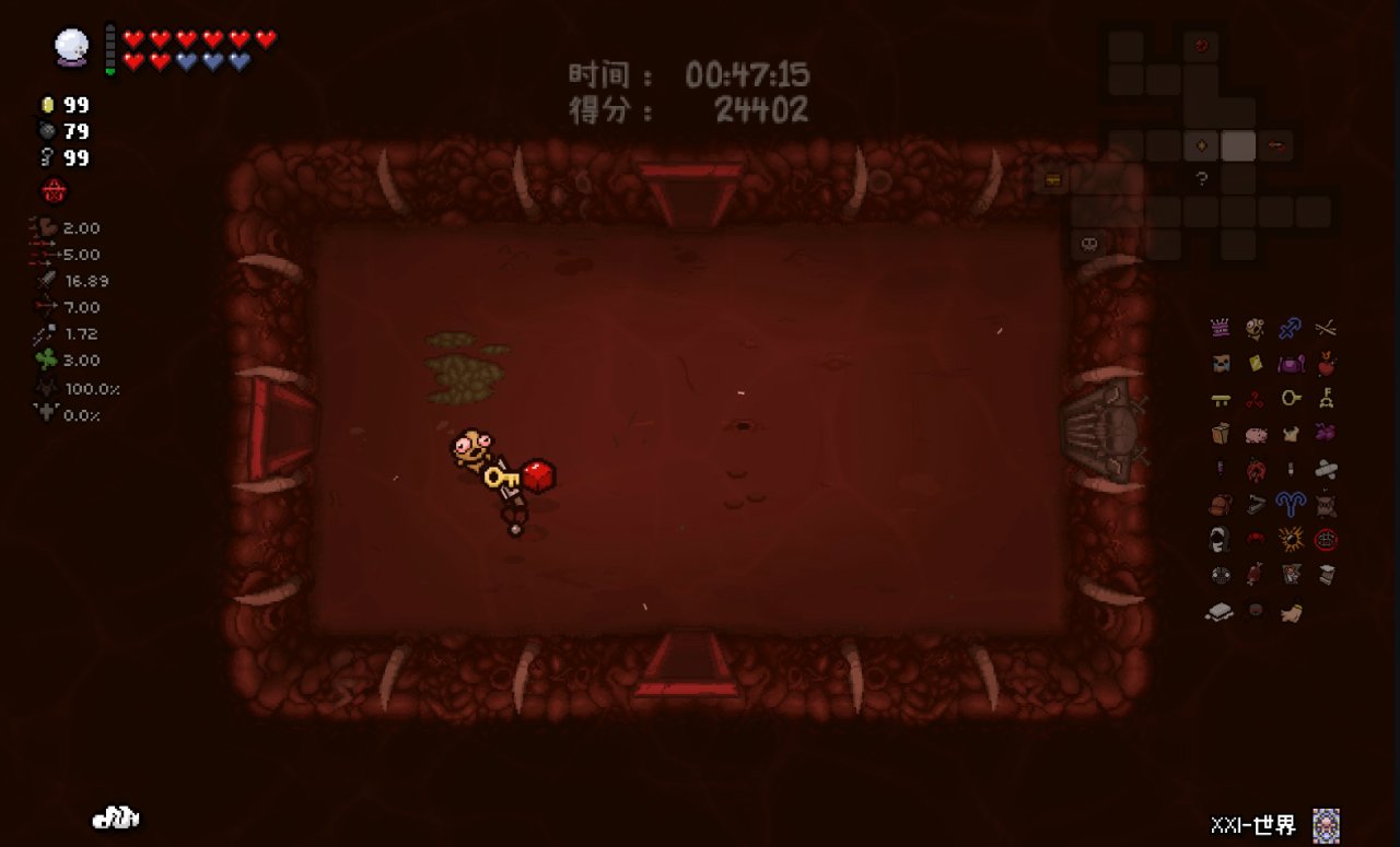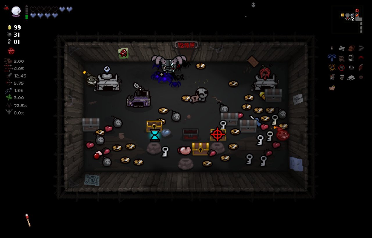 注意:爲了在第八層能夠開啓惡魔房前往地獄,所以這裏我選擇在第七層的BOSS房直接讓紅心受到傷害,扣光了本層的惡魔房概率,這樣下層就可以有更高的概率開啓惡魔房