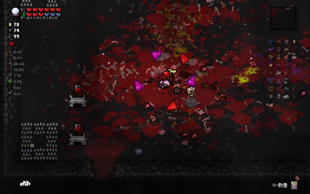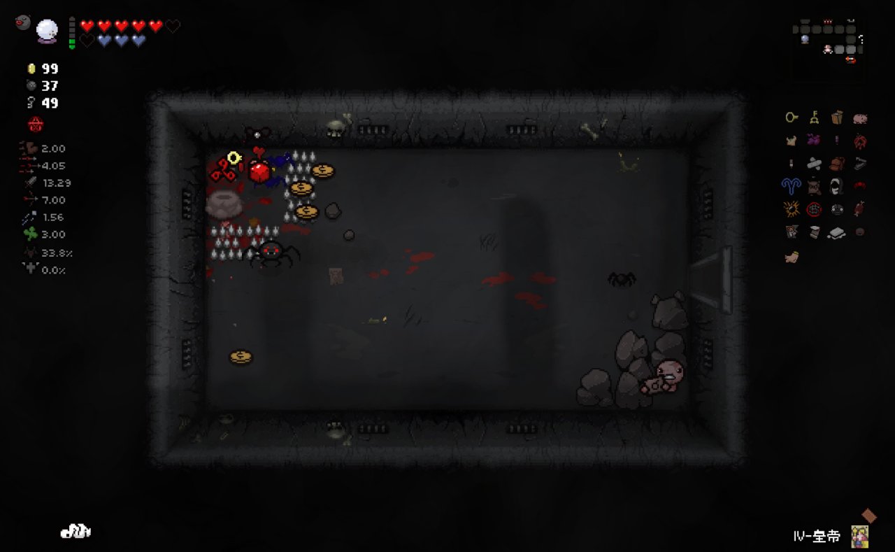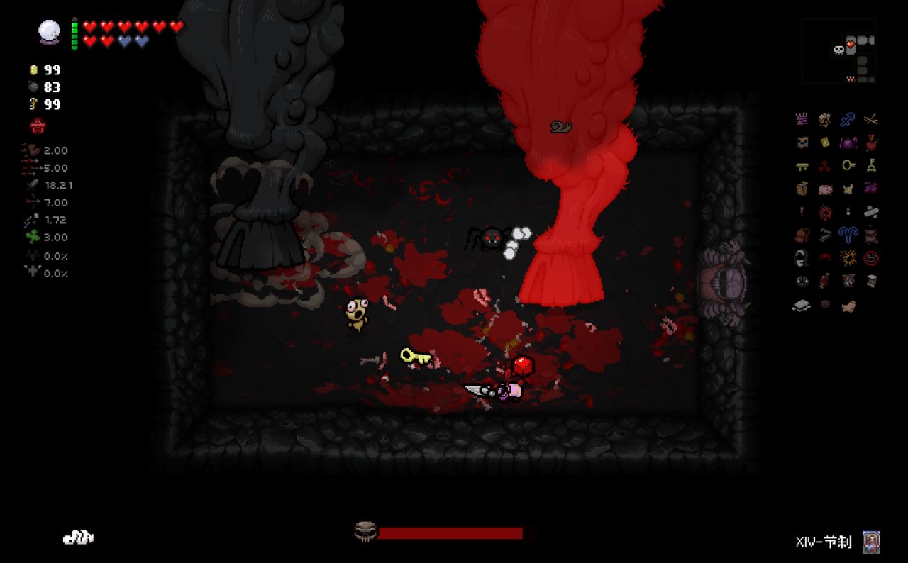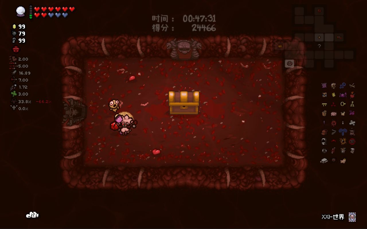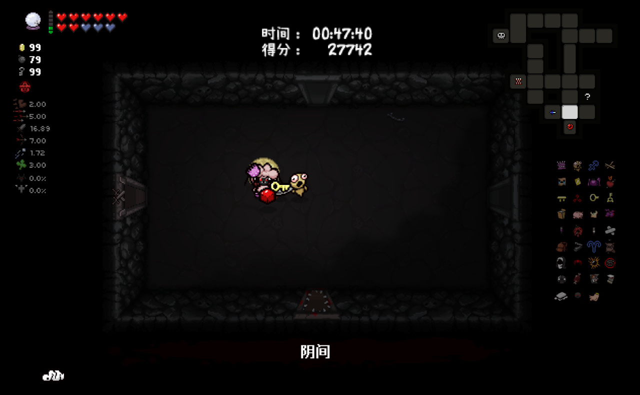 注意:爲了在第八層能夠開啓惡魔房前往地獄,所以這裏我選擇在第七層的BOSS房直接讓紅心受到傷害,扣光了本層的惡魔房概率,這樣下層就可以有更高的概率開啓惡魔房