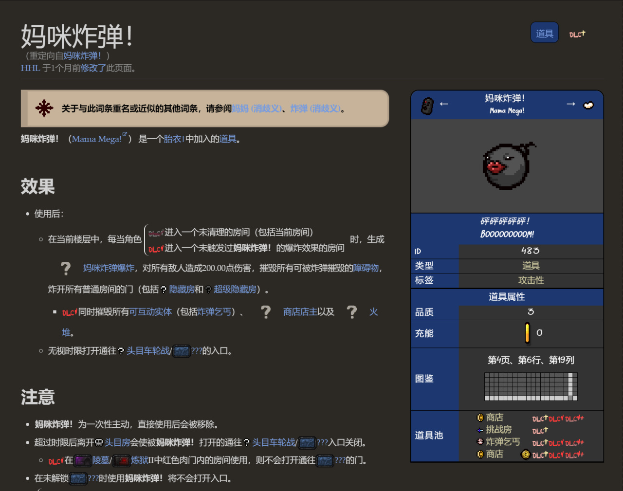道具效果:一次性——使用後, 每當角色進入一個未觸發媽咪炸彈效果的房間,就會觸發媽咪炸彈爆炸