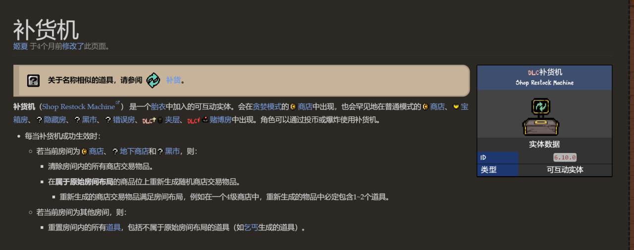 往補貨機投入硬幣,有概率清除房間內的所有商店交易物品,然後在屬於原始房間佈局的商品位上重新生成隨機商店交易物品。(比如上圖的商店從左到右分別賣了道具-基礎資源-基礎資源,補貨之後商店佈局依舊是道具-基礎資源-基礎資源)