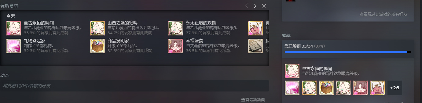 非常好,每周都有新的机制、新的商品、新的挑战,直到完成主线都一直是有新的东西出现,也就是通关前时刻都有新鲜感存在。游戏是我喜欢的异世界穿越题材,游戏中的女主们都挺好的,共有四个女角色,而我的目标一直都很明确,那就是女神妮可,雌小鬼必须薄纱,当然其他女主也很不错,特别是艾莉诺的双马尾女仆装,那是真的好看。游戏全程CV听着感觉不错。就是游戏流程较短,我3个小时多一点就差不多全成就了差一个隐藏成就,但这个价钱也还能接受,毕竟女主们挺好看的,剧情也还过得去,如果你对这里面的四个女主们不感兴趣那就不值吧。