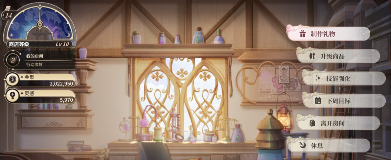 当经营结束后会进入每周的休息界面,大部分的操作都需要消耗行动力,行动力在商店等级下面的数字“2”那里,那就是剩余行动力。