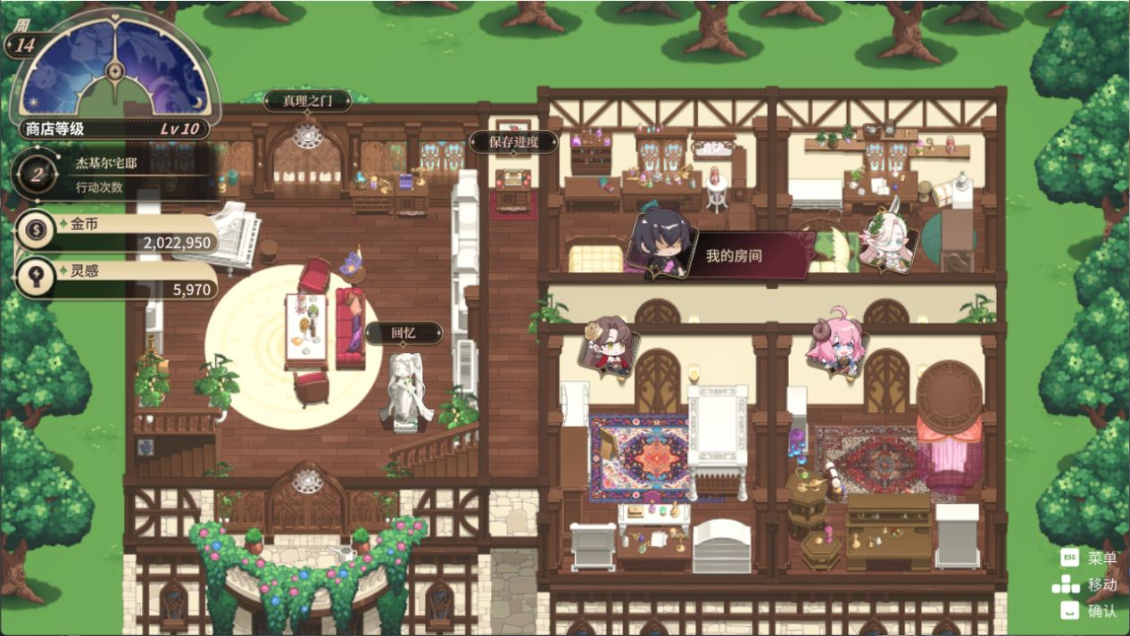 这时可以去真理之门打怪拿灵感,也可以去女主们的房间与女主交谈加深感情,还可以回到自己的房间做一些对商店的发展有益的事。
