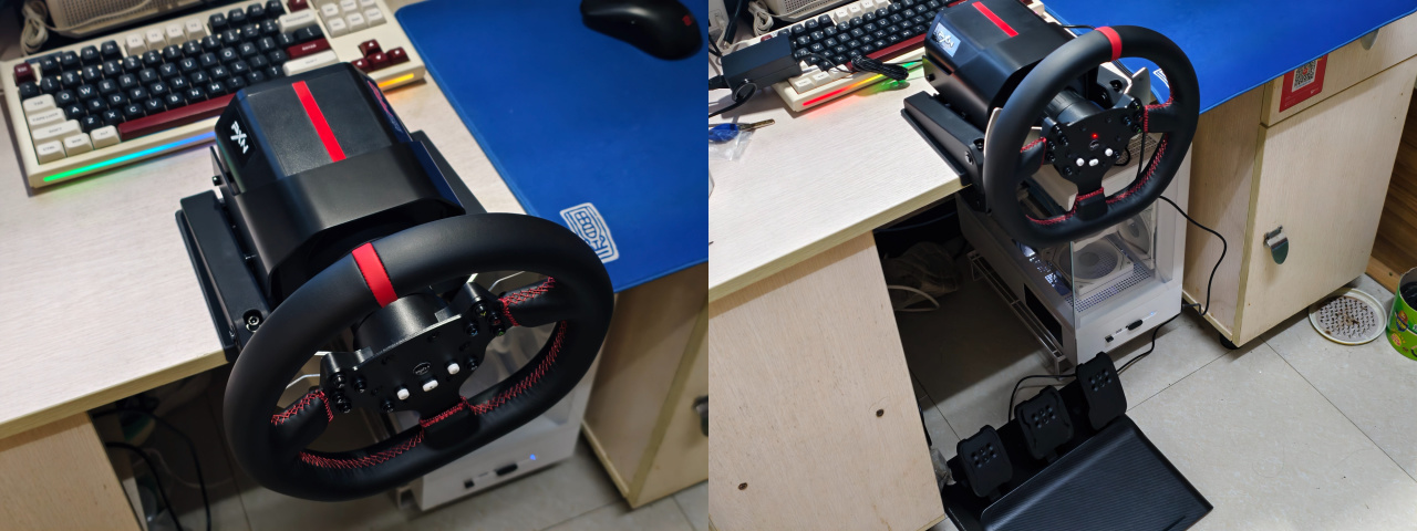 毕竟是套件,单独一个方向盘都还好说,这踏板的确是实打实需要你拥有上床下桌,或者退而求其次,有个像样的专属桌子+座位的寝室配置。