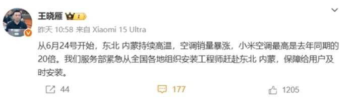 小米集團副總裁王曉雁微博稱,自 6 月 24 日起,東北及內蒙古地區空調銷量最高達去年同期的 20 倍 。