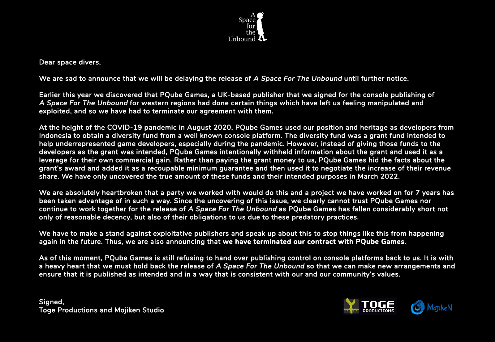今日(8月24日),Mojiken Studio工作室宣布游戏《无垠之心》延期,具体发售时间直到游戏发行商PQube问题解决后公布,公告显示,这家英国发行商于2020年8月利用Mojiken Studio工作室名义从一个知名主机平台处获得巨额资助后并未将这笔巨款发给工作室用于游戏开发,而是以此为自己谋利。