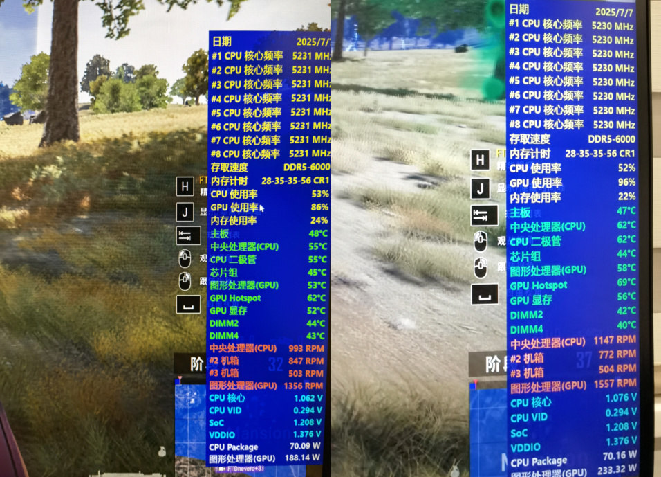 接下来是游戏内测试,采用了《绝地求生PUBG》游戏内回放同一局录像,如下左边为h612a的温度表现,右边为JF150RS: