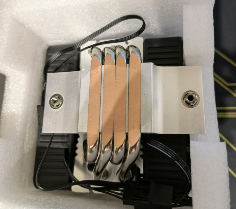 散热器本体重量较轻,采用了四热管+穿fin工艺,底部为热管直触: